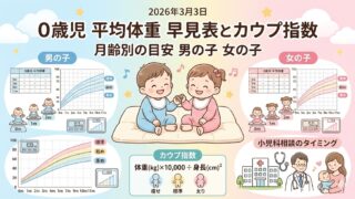 ねんね・生活リズム0歳児 平均体重がひと目でわかる 月齢別早見表とカウプ指数 男の子女の子の目安と小児科相談のタイミング 0歳の赤ちゃんの平均体重を月齢別に男女で早見表にしました。軽め重めの目安やカウプ指数の計算方法、成長曲線の見方、小児科に相談した方がよいサインも分かります。 2026.03.03ねんね・生活リズム