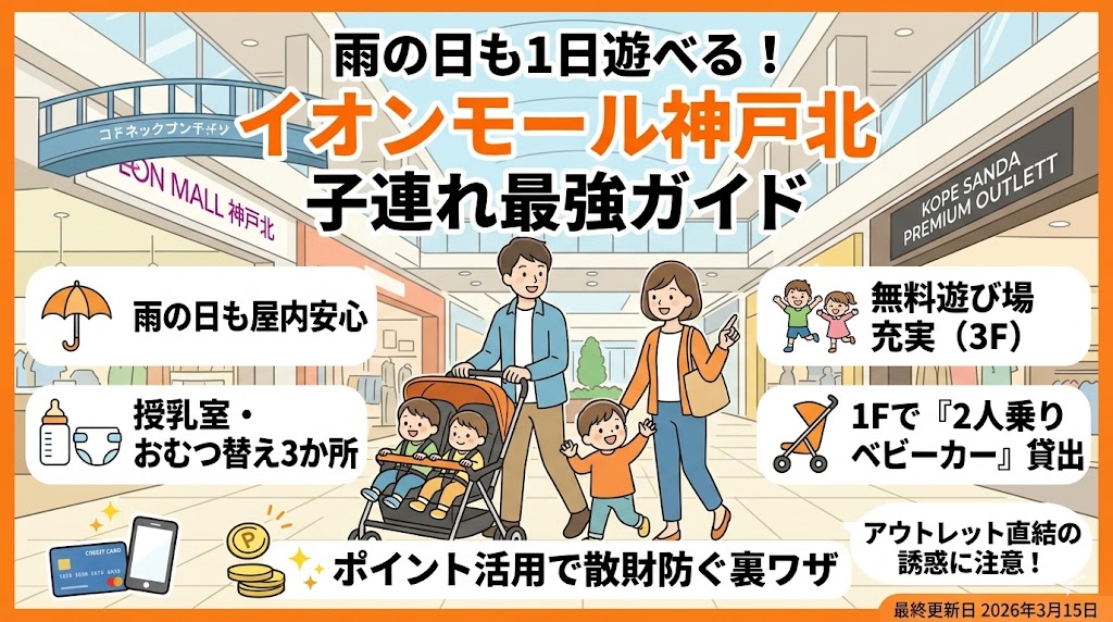 さらに「神戸三田プレミアム・アウトレット」に連絡橋で直結しているため、「午前中はイオンの子ども向けエリアで遊び、午後はアウトレットで親の買い物」という黄金リレーが組みやすいのが最大の魅力です。