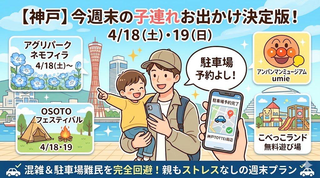 ただし今回は、TOTTEI周辺がかなり混みやすい週末です。OSOTO FESTIVAL、ワンダーウォーク神戸、神戸ストークスのホーム最終戦、さらにKOBE BUBBLUMIの最終週末が重なるので、海辺エリアに無計画で車移動すると親の体力が先に削られます。